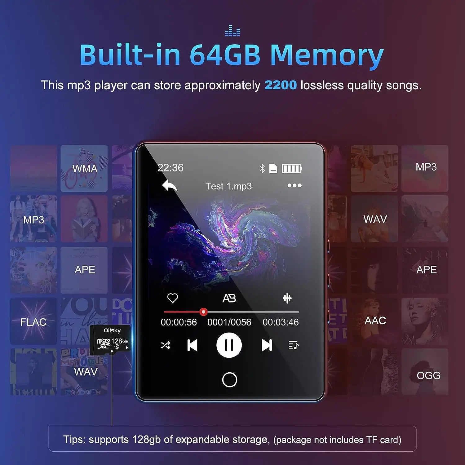 【64GB Mp3 Player】This bluetooth mp3 player has a built-in 64GB flash memory which provides you with a better durability than only a SD expanted memory. Max 128GB expansion if needed.
